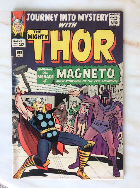 I just scored the deal of the year with this copy of Journey Into Mystery #109 from 1964! I've been looking for this issue for awhile, but every copy I've come across was overpriced or in immaculate condition and priced accordingly. I found this copy at one of my local comic shops in a box of comics that had yet to be priced, so I asked the owner what he wanted for it. He looks it over and says; "I'd say that's about a good 3.0 - how about $12?" I nearly choked, but I managed to exclaim; "SOLD!!" When I got home, I looked at it more carefully, and I would call it a solid VG/VG+ and worth closer to $70-$75. Oh happy day!!!